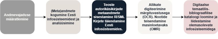 - Märksõnad (Tadirah): Kataloogimine, Andmete kogumine, Optiline noodituvastus, Arhiveerimine, Säilitamine, Levitamine, Avaldamine