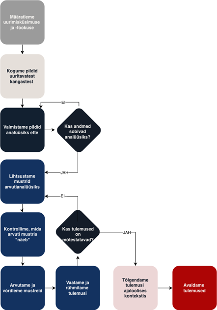 Töövoog kirjeldab protsessi alates muuseumikogude piltide kogumisest ja standardiseerimisest kuni mustrianalüüsi tulemuste tõlgendamiseni. Praegu oleme uurimuses tulemuste tõlgendamise faasis.